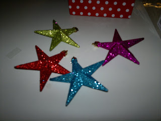 Glittriga stjärnor i härliga färger :) fanns bollar, karameller och droppar också av dessa färger så det var svårt att välja :)